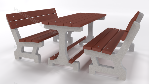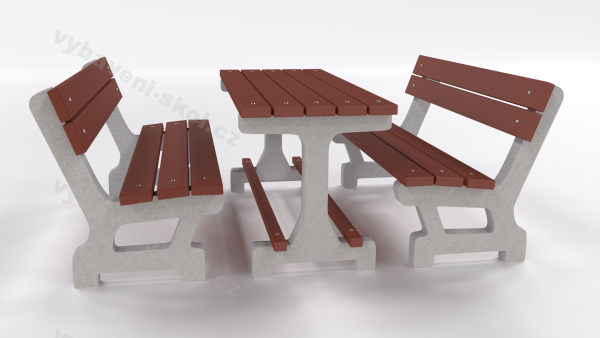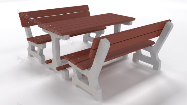 Bezúdržbový set je složen z 2 x lavičky s opěradlem a stolu. Vše vyniká svojí bezúdržbou a dlouhou životností. Nohy z betonu, prkna z recyklovaného plastu a ocelové výztuhy. Lavičková prkna jsou vyrobena z recyklátu (recyklovaného plastu) a mají vynikající odolnost proti povětrnostním vlivům, vlhkosti a běžným chemikáliím. Jsou nenasákavé, mají lehce čistitelný povrch a nevyžadují ani z dlouhodobého hlediska žádnou údržbu.