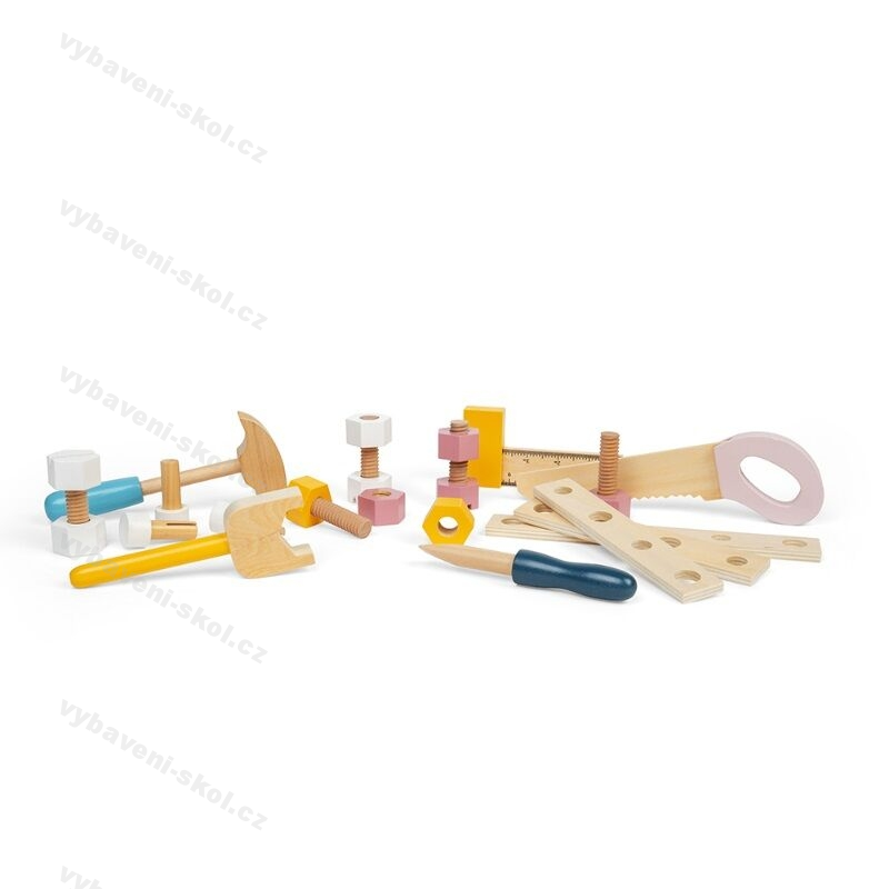 Hledáte vhodnou hračku pro svého malého řemeslníka? Výběrem tohoto dřevěného pracovního stolu udeříte hřebíček na hlavičku :-) Stůl podporuje objevování prostřednictvím hry, rozvíjí koordinaci, jemné motorické dovednosti, zručnost malých dětí a základy fungování nářadí. Je dodáván s pilou, klíčem, kladívkem, šroubovákem, úhelníkem a spoustou matic a šroubů. Navržen v jemných neutrálních barvách, takže bude vypadat nádherně v každém dětském pokoji nebo dětské herně. Vyrobeno z prvotřídního, udržitelného dřeva s certifikací FSC a barveno netoxickými barvami a laky.