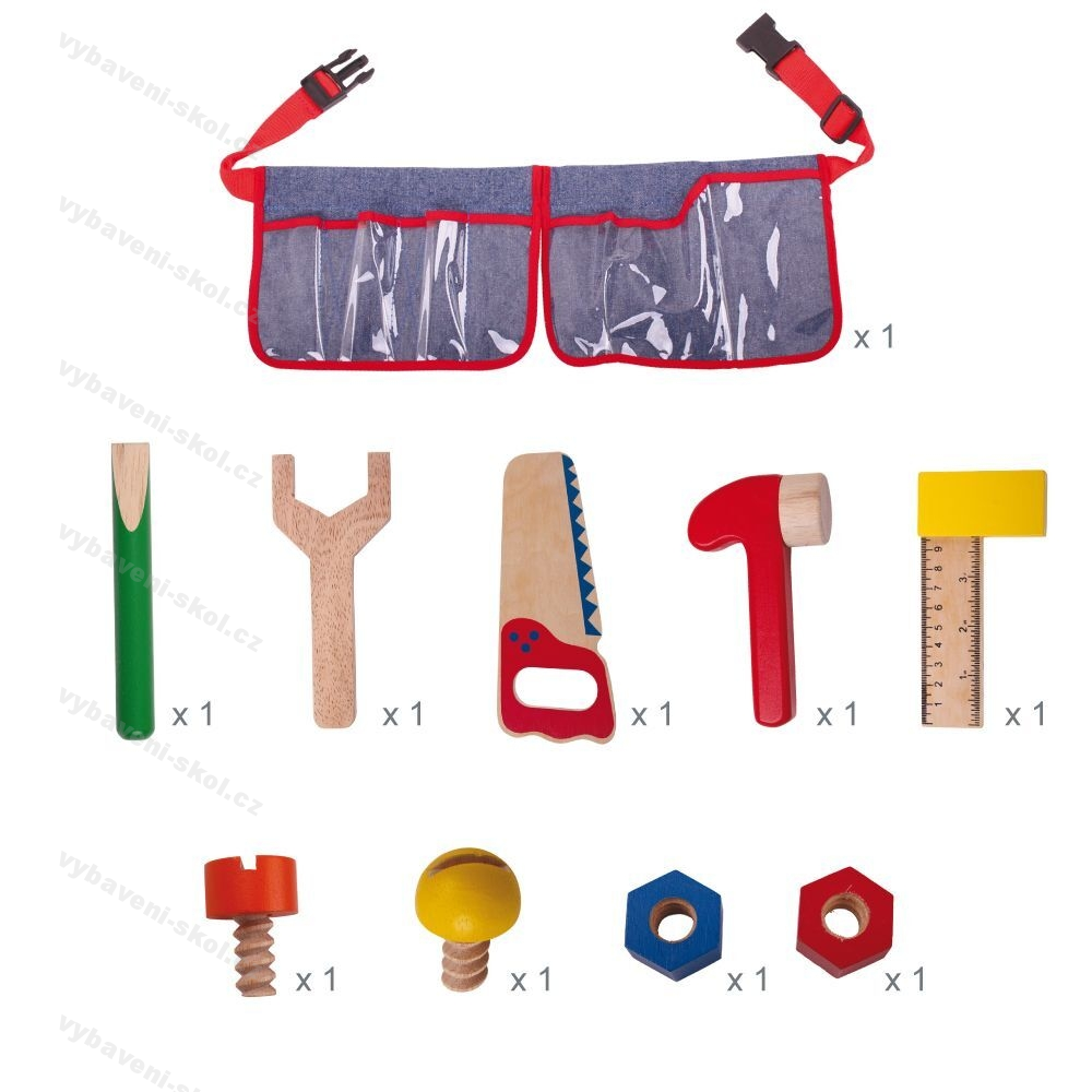 Tento první opasek na nářadí se skládá z bezpečných dřevěných předmětů, které dětem umožní objevovat radost z oprav a vytváření věcí. Každá dřevěná pomůcka má ideální velikost pro malé ruce a vaše dítě určitě zaujme. Pestrobarevný pásek má nastavitelnou sponu, která umožňuje vašemu dítěti nosit pásek a ponechat mu volné ruce pro kreativní hraní rolí. Pomáhá rozvíjet obratnost a koordinaci. Vyrobeno z vysoce kvalitních, zodpovědně získaných materiálů. Splňuje aktuální evropské bezpečnostní normy. Skládá se z 10 dílů.