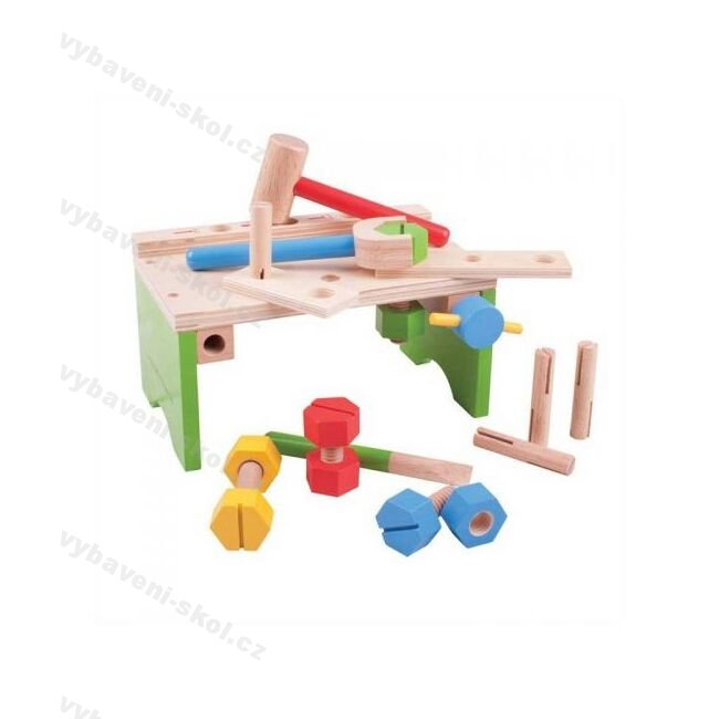 Tento chytře navržený dřevěný tesařský ponk obsahuje dřevěný klíč, kladivo a spoustu šroubů, matic a zatloukacích špalíků. Vyrobeno z kvalitních materiálů, který byl zodpovědně získán z přírodních zdrojů. Tato dřevěná hračka odpovídá současným evropským bezpečnostním normám. Skládá se ze 14 hracích prvků.