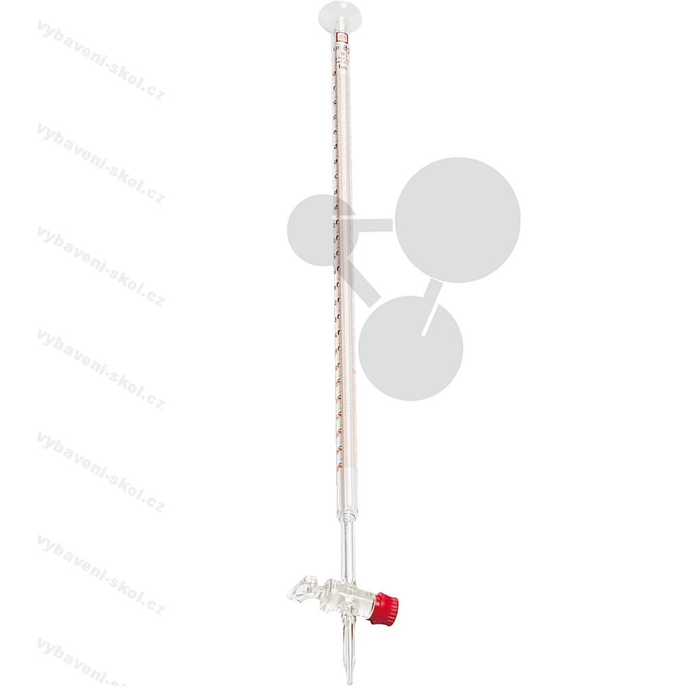 Skleněná byreta se stupnicí, nálevkou a přímým kohoutkem, třída B.