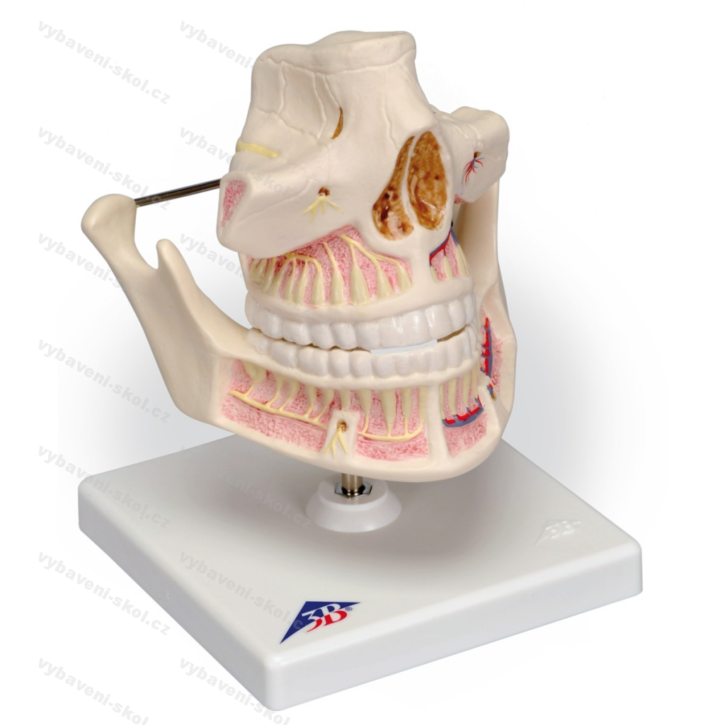 Plastový model. Detailní zpracování horní i dolní čelisti. Zřetelně viditelné kořeny zubů, kostní tkáň, cévy a nervy. Pohyblivá dolní čelist. Na stojanu. Špičková kvalita 3B Scientific. Velikost 16 x 12 x 13 cm, hmotnost 0,6 kg.