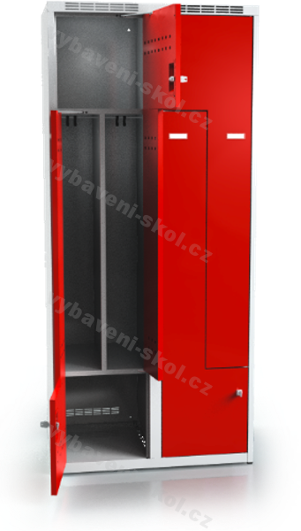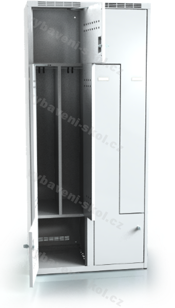 Maloobjemové šatní skříně mají dvě křídla dveří umístěna v jednom oddělení. Každý uživatel má k dispozici odkládací polici umístěnou přes celou šířku oddělení a zúžený prostor pro zavěšení oděvů se šatní tyčkou a plastovými háčky. Doporučujeme doobjednat plastovou vaničku na obuv ze sortimentu originálního příslušenství. V nabídce jsou varianty s dveřmi ve tvaru Z a verze s dveřmi ve tvaru V. Jejich využití je vhodné všude tam, kde je potřeba na malém prostoru umístit skříňky pro velké množství uživatelů. V nabídce jsou tři produktové linie, které se od sebe odlišují konstrukcí dveří a rozsahem standardní výbavy. Šatní skříně s vloženými dveřmi se vyznačují univerzální využitelností, odolnou svařovanou konstrukcí, moderním vzhledem a pečlivým zpracováním. Kovové díly jsou vyrobeny z ocelového plechu se zvýšenou pevností. Ocelový korpus je vybaven účinným systémem přirozeného odvětrávání a je osazen plastovými kluzáky (možnost výškově stavitelných kluzáků). Rámová konstrukce přední části korpusu je nově profilovaná. Poskytuje tak vyšší odolnost proti násilnému vtlačení dveří do korpusu a zároveň tvoří tuhou oporu bezpečnostní závory zámku. Dveře jsou jednoplášťové, výztužné profilem přes celou výšku dveří, zesílení konstrukce v oblasti zámku – ochrana proti protočení a vyhnutí závory. Dveře jsou zavěšené na masivních kovových čepech, maximální úhel otevření dveří 100° a jsou vybaveny cylindrickým, otočným bezpečnostním uzávěrem nebo otočným uzávěrem bez příplatku, další zámky (mincovní, kódové nebo elektronické) jsou za příplatek. Povrchová úprava ocelového ve standardním provedení je ocelový plech s úpravou fosfátu a práškové vypalovací barvy v odstínu Ral 7035 (šedá matná) konstrukce. Na dotaz nadstandardní vybavení s možností jejich doplnění do skříně (šikmá stříška, výška soklu, zámky, atd.).