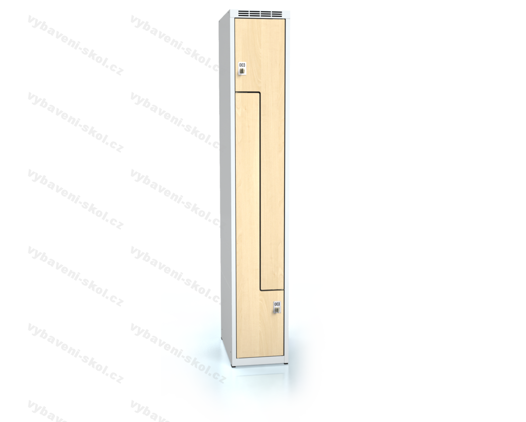 Maloobjemové šatní skříně mají dvě křídla dveří umístěna v jednom oddělení. Každý uživatel má k dispozici odkládací polici umístěnou přes celou šířku oddělení a zúžený prostor pro zavěšení oděvů se šatní tyčkou a plastovými háčky. Doporučujeme doobjednat plastovou vaničku na obuv ze sortimentu originálního příslušenství. V nabídce jsou varianty s dveřmi ve tvaru Z a verze s dveřmi ve tvaru V. Jejich využití je vhodné všude tam, kde je potřeba na malém prostoru umístit skříňky pro velké množství uživatelů. V nabídce jsou tři produktové linie, které se od sebe odlišují konstrukcí dveří a rozsahem standardní výbavy. Šatní skříně s vloženými dveřmi se vyznačují univerzální využitelností, odolnou svařovanou konstrukcí, moderním vzhledem a pečlivým zpracováním. Kovové díly jsou vyrobeny z ocelového plechu se zvýšenou pevností. Ocelový korpus je vybaven účinným systémem přirozeného odvětrávání a je osazen plastovými kluzáky (možnost výškově stavitelných kluzáků). Rámová konstrukce přední části korpusu je nově profilovaná. Poskytuje tak vyšší odolnost proti násilnému vtlačení dveří do korpusu a zároveň tvoří tuhou oporu bezpečnostní závory zámku. Dveře jsou z lamino desky s ABS hranou s možností výběru dekoru. Dveře jsou dodávány s omezovačem otevření dveří a zavěšené na masivních kovových čepech, maximální úhel otevření dveří 100° a jsou vybaveny cylindrickým, otočným bezpečnostním uzávěrem nebo otočným uzávěrem bez příplatku, další zámky (mincovní, kódové nebo elektronické) jsou za příplatek. Standardní výbava skříňky police, šatní tyč s nosností 10 kg, v každém oddělení tři plastové háčky s nosností 4 kg, každá skříň je vybavena montážními otvory pro spojení do řad a pro montáž ke konstrukci předlavičky. Povrchová úprava ocelového ve standardním provedení je ocelový plech s úpravou fosfátu a práškové vypalovací barvy v odstínu Ral 7035 (šedá matná) konstrukce. Na dotaz nadstandardní vybavení s možností jejich doplnění do skříně (šikmá stříška, výška soklu, zámky, atd.).