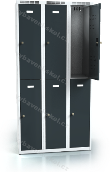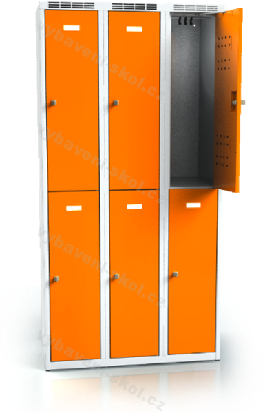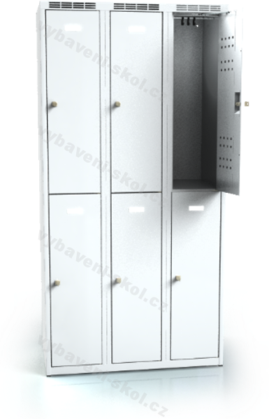 Maloobjemové dělené šatní skříně mají dvě křídla dveří umístěna nad sebou v jednom oddělení. Jejich využití je vhodné všude tam, kde je potřeba na malém prostoru umístit skřínky pro velký počet uživatelů. Je však třeba počítat s tím, že velikost se pohybuje v závislosti na zvolené šířce oddělení, pouze v rozmezí cca 100-160 dm3. V nabídce jsou tři produktové linie, které se odlišují konstrukcí dveří a rozsahem vybavení. Šatní skříně s vloženými dveřmi se vyznačují univerzální využitelností, odolnou svařovanou konstrukcí, moderním vzhledem a pečlivým zpracováním. Kovové díly jsou vyrobeny z ocelového plechu se zvýšenou pevností. Ocelový korpus je vybaven účinným systémem přirozeného odvětrávání a je osazen plastovými kluzáky (možnost výškově stavitelných kluzáků). Uvnitř každého oddělení je uchycená šatní tyč s plastovými háčky. Rámová konstrukce přední části korpusu je nově profilovaná. Poskytuje tak vyšší odolnost proti násilnému vtlačení dveří do korpusu a zároveň tvoří tuhou oporu bezpečnostní závory zámku. Dveře jsou dvouplášťové, s nadstandardní odolností proti ohýbání a kroucení dveří, zesílení konstrukce v oblasti zámku – ochrana proti protočení a vyhnutí závory. Dveře jsou dodávány s omezovačem otevření dveří a zavěšené na masivních kovových čepech, maximální úhel otevření dveří 100° a jsou vybaveny cylindrickým, otočným bezpečnostním uzávěrem nebo otočným uzávěrem bez příplatku, další zámky (mincovní, kódové nebo elektronické) jsou za příplatek. Standardní výbava, šatní tyč s nosností 10 kg, v každém oddělení tři plastové háčky s nosností 4 kg, každá skříň je vybavena montážními otvory pro spojení do řad a pro montáž ke konstrukci předlavičky. Povrchová úprava ocelového ve standardním provedení je ocelový plech s úpravou fosfátu a práškové vypalovací barvy v odstínu Ral 7035 (šedá matná) konstrukce. Na dotaz nadstandardní vybavení s možností jejich doplnění do skříně (povrchová úprava zinkem, šikmá stříška, výška soklu, zámky, atd.).