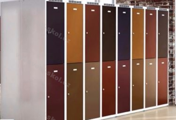 Maloobjemové dělené šatní skříně mají dvě křídla dveří umístěna nad sebou v jednom oddělení. Jejich využití je vhodné všude tam, kde je potřeba na malém prostoru umístit skřínky pro velký počet uživatelů. Je však třeba počítat s tím, že velikost se pohybuje v závislosti na zvolené šířce oddělení, pouze v rozmezí cca 100-160 dm3. V nabídce jsou tři produktové linie, které se odlišují konstrukcí dveří a rozsahem vybavení. Šatní skříně s vloženými dveřmi se vyznačují univerzální využitelností, odolnou svařovanou konstrukcí, moderním vzhledem a pečlivým zpracováním. Kovové díly jsou vyrobeny z ocelového plechu se zvýšenou pevností. Ocelový korpus je vybaven účinným systémem přirozeného odvětrávání a je osazen plastovými kluzáky (možnost výškově stavitelných kluzáků). Uvnitř každého oddělení je uchycená šatní tyč s plastovými háčky. Rámová konstrukce přední části korpusu je nově profilovaná. Poskytuje tak vyšší odolnost proti násilnému vtlačení dveří do korpusu a zároveň tvoří tuhou oporu bezpečnostní závory zámku. Dveře jsou z lamino desky s ABS hranou s možností výběru dekoru. Dveře jsou dodávány s omezovačem otevření dveří a zavěšené na masivních kovových čepech, maximální úhel otevření dveří 100° a jsou vybaveny cylindrickým, otočným bezpečnostním uzávěrem nebo otočným uzávěrem bez příplatku, další zámky (mincovní, kódové nebo elektronické) jsou za příplatek. Standardní výbava skříňky šatní tyč s nosností 10 kg, v každém oddělení tři plastové háčky s nosností 4 kg, každá skříň je vybavena montážními otvory pro spojení do řad a pro montáž ke konstrukci předlavičky. Povrchová úprava ocelového ve standardním provedení je ocelový plech s úpravou fosfátu a práškové vypalovací barvy v odstínu Ral 7035 (šedá matná) konstrukce. Na dotaz nadstandardní vybavení s možností jejich doplnění do skříně (šikmá stříška, výška soklu, zámky, atd.).