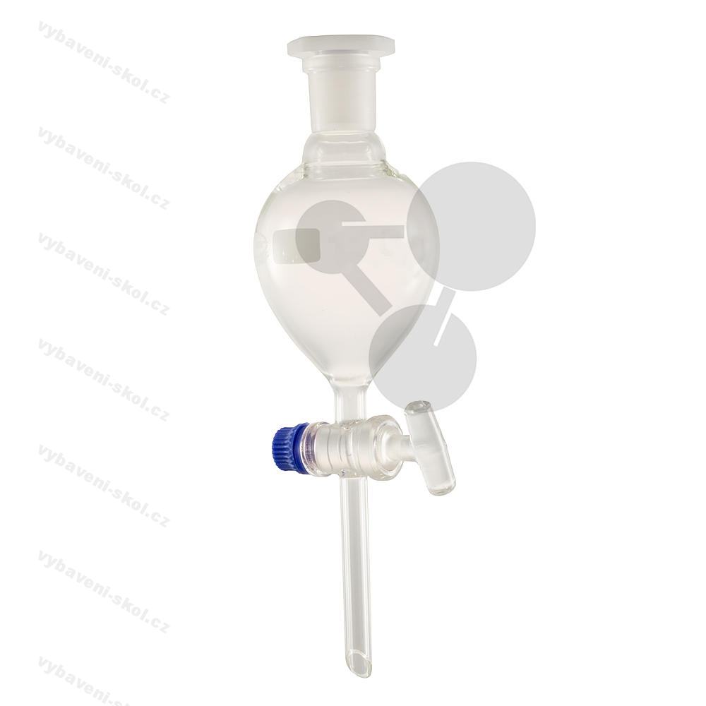 Z borosilikátového skla 3.3, ve tvaru hrušky. Kohoutek je vyroben z PTFE a dodává se s kónickou zátkou.