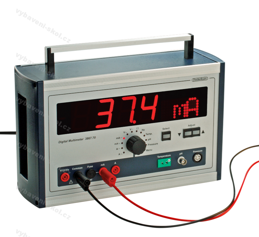 Univerzální demonstrační měřící přístroj pro fyziku i chemii. Měří napětí, proud, odpor, pH, teplotu.