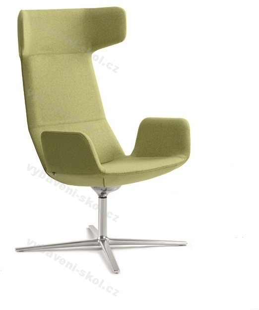 Designové křeslo vysoké, otočné, celočalouněné područky, kříž hliník leštěný 4-ramenný, kluzáky. Sedák a opěrák čalouněný, materiál studená pěna tl. 50 mm.