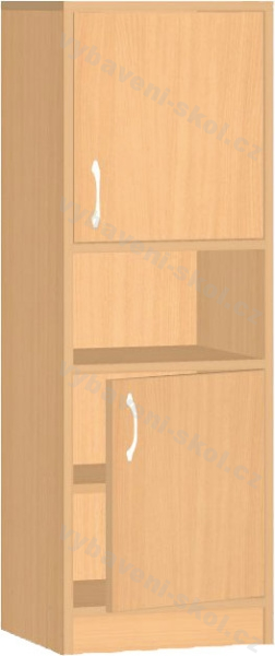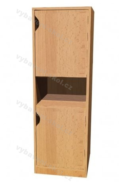 Univerzální dětský nábytek, snadno kombinovatelný. Vysoká dřevěná skříňka s dvířky a policí. Rozměry:121x40x45 cm (V x Š x H).
