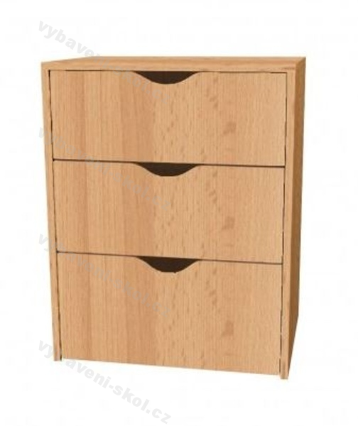 Univerzální dětský nábytek, snadno kombinovatelný. Nízká dřevěná skříňka s třemi zásuvkami bez soklu. Rozměry: 60x76x45 cm (ŠxVxH).