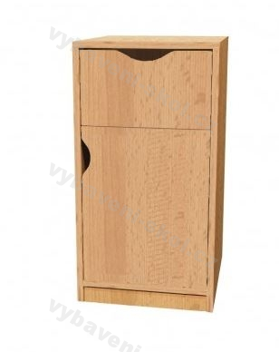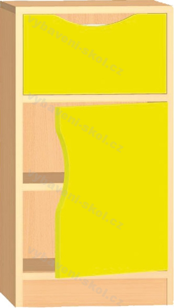 Nízká skříňka poskytuje kombinovaný úložný prostor k uschování dětských hraček i oblečení. Je opatřena zásuvkou, úložný prostor ve spodní části je krytý dvířky. Skříňku je možné kombinovat s dalšími nábytkovými díly. Oboustranné provedení skříňky. Korpus skříňky je standardně vyráběn ve dvou dezénech lamino desek o síle 18 mm. Dvířka a zásuvka je v několika barevných provedeních lamino desek o síle 18 mm (barevné spektrum v naší nabídce). Všechny namáhané plochy jsou opatřeny 2mm ABS hranou, která je chrání před poničením a dá se vybrat z několika barevných variant. Dětská skříňka může být zapojena do širší koncepce nábytkové sestavy.
