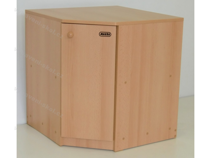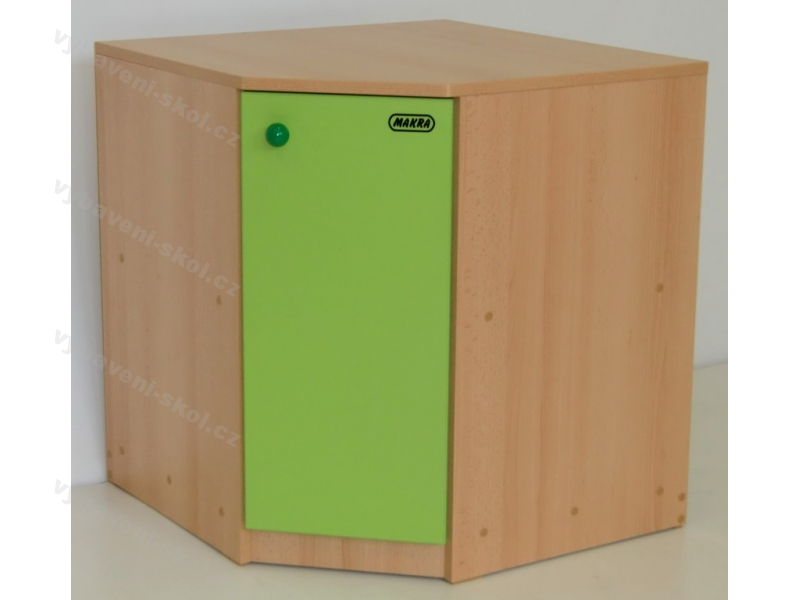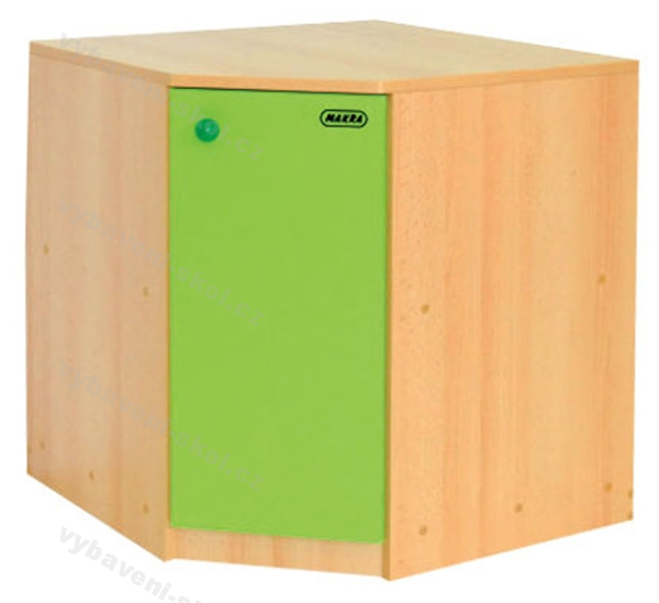 Rohová skříňka k umístění do dětských pokojíčků nebo jako součást dětských sektorových kuchyněk na hraní. Nízká skříňka poskytuje úložný prostor (dvě široké police) pro dětské nádobíčko, hračky nebo oblečení. Korpus skříňky je standardně vyráběn ve třech dezénech lamino desek o síle 18 mm. Dvířka jsou v několika barevných provedeních lamino desek o síle 18 mm. Všechny namáhané plochy jsou opatřeny 0,5 až 2 mm ABS hranou, která je chrání před poničením a dá se vybrat z několika barevných variant.