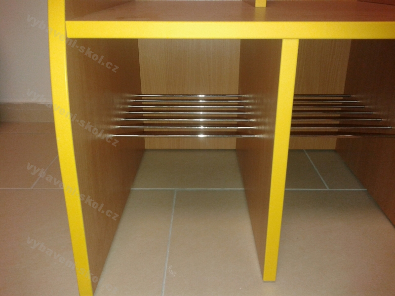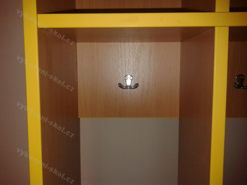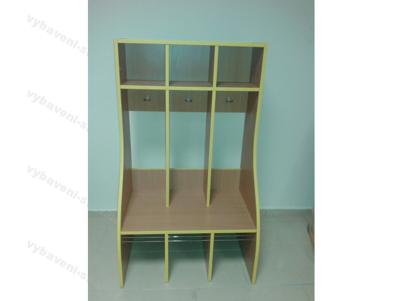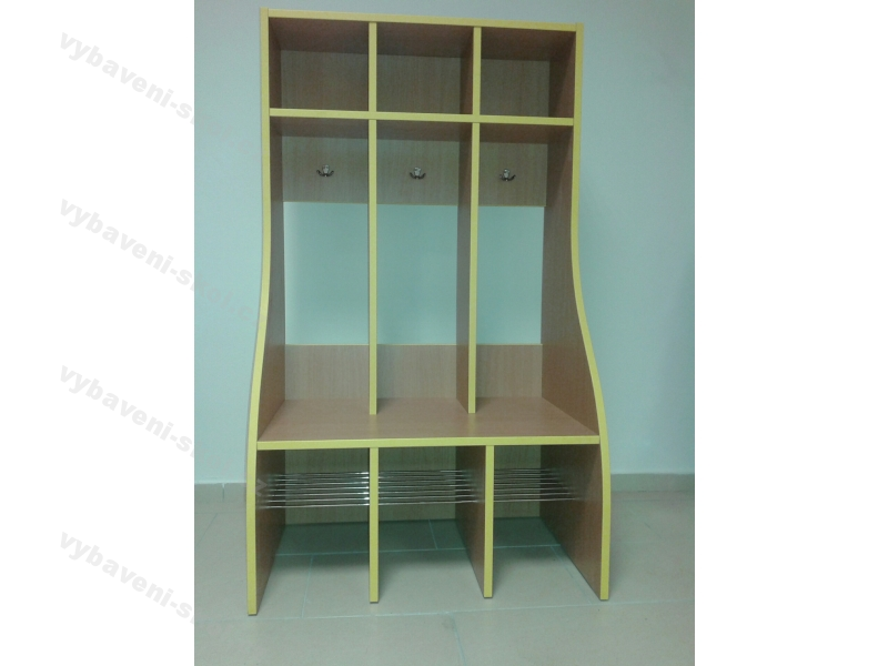 Kvalitní a praktický nábytek do všech dětských interiérů. Třímístná šatní skříň je vyrobená z kvalitní laminované dřevotřísky (18 mm) v dekoru buk, funkční plochy jsou opatřeny hranami ABS (zajišťují dlouhou životnost nábytku). Barevné provedení hrany volte dle vzorníku. Šatna je vybavena horní odkládací policí o rozměrech 23x20x22 cm (ŠxVxH) vhodná pro odložení menších oděvů, hraček aj. Každý odkládací prostor pro bundy, kabátky a mikiny je vybaven praktickým kovovým dvojháčkem. Spodní odkládací prostor vhodný pro umístění bačkůrek a botiček o rozměru 23x34x47 cm (ŠxVxH) obsahuje kvalitní kovový rošt. Spodní odkládací prostor je koncipován pro snadný úklid. Prostor pro sezení dětí ve výšce 35 cm. Kvalitní materiály a provedení.