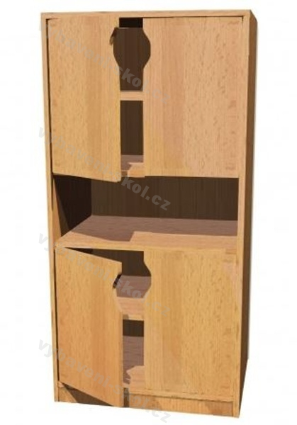 Univerzální vysoká dětská skříňka jako kvalitní dřevěný nábytkový program. Korpus skříňky je standardně vyráběn ve dvou dezénech lamino desek o síle 18 mm. Dvířka jsou v několika barevných provedeních lamino desek o síle 18 mm (barevné spektrum v naší nabídce). Všechny namáhané plochy jsou opatřeny 2mm ABS hranou, která je chrání před poničením a dá se vybrat z několika barevných variant. Na zadní straně skříňky je sololit, na vyžádání pohledová záda za příplatek. (V případě zájmu o pohledová záda napište Váš požadavek do poznámky, cena Vám bude kalkulována). Díky své univerzálnosti ji lze začlenit mezi ostatní dětský nábytek.