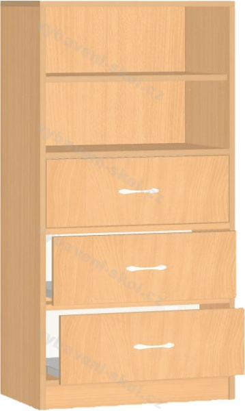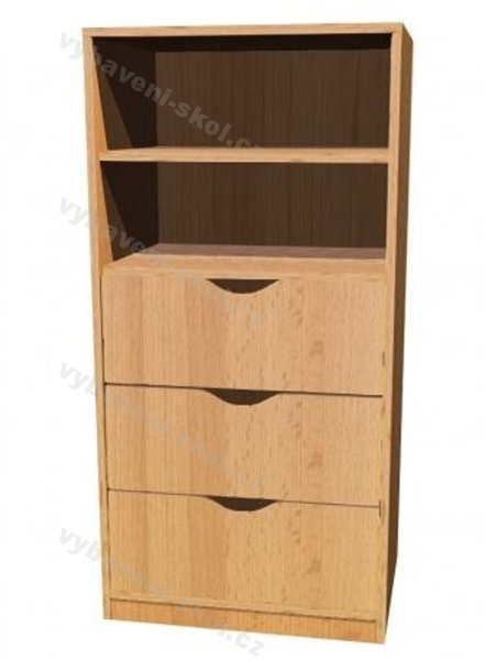 Univerzální dětský nábytek, snadno kombinovatelný. Vysoká dřevěná skříňka s třemi zásuvkami a policemi. Rozměry: 121x60x45 cm (V x Š x H).