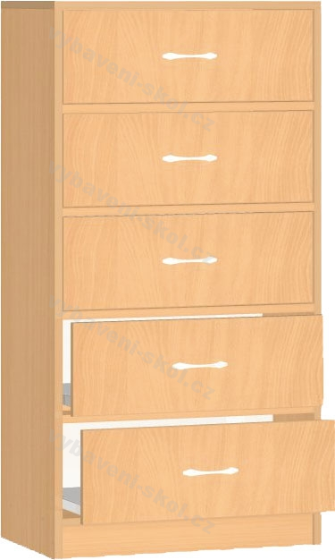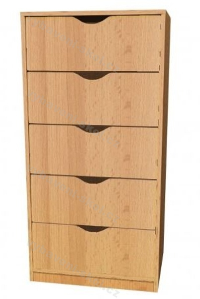 Univerzální dětský nábytek, snadno kombinovatelný. Vysoká dřevěná skříňka s pěti zásuvkami. Rozměry:121x60x45 cm (V x Š x H).
