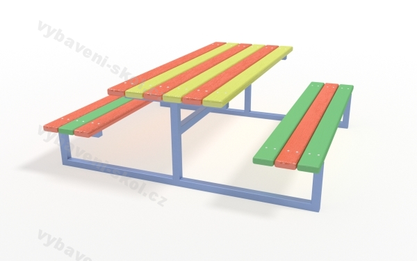 Konstrukce z jekl. profilu 30x30 mm. Smrkové latě sedáku a opěráku a stolu o rozměrech 1500x70x35 mm (DxŠxT).