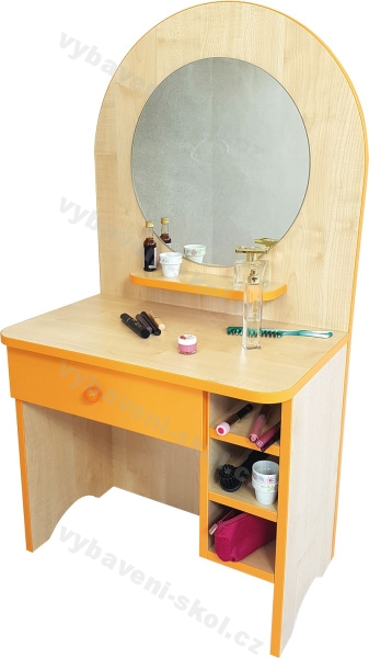 Oblíbená dětská hrací sestava dřevěný kadeřnický salon. Sestava vhodná do prostředí mateřských škol, dětských pokojíčků, hracích místností. Kadeřnický salon obsahuje kulaté zrcadlo, šuplík pro uložení kadeřnických pomůcek a několik poliček. Salon s osvětlením. Korpus sestavy je standardně vyráběn ve dvou dezénech lamino desek o síle 18 mm. Všechny namáhané plochy jsou opatřeny 0,5 až 2 mm ABS hranou, která je chrání před poničením s možností výběru barevného provedení.