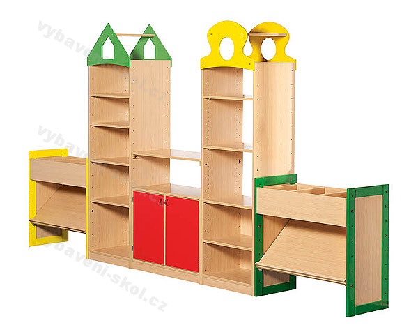 Nábytková sestava složená z jednotlivých komponentů nábytkového programu MIKI PLUS. Korpusy a dvířka skříněk jsou vyrobeny z laminované dřevotřísky v několika dezénech o síle 18 mm, hrany jsou ošetřeny proti poškození 2 mm ABS hranou. Zásuvky jsou vyrobeny ze spárové bukové desky v několika barevných provedeních a jsou ošetřeny polyuretanovým lakem.