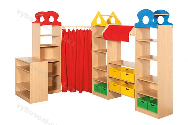 Oblíbená dřevěná nábytková sestava do dětských pokojíčků, center, herny, mateřských a základních škol. Praktické a pevné skříně, poličky, zásuvky s úložným a hracím prostorem. Atraktivní barevné stříšky vysokých policových skříní. Bezpečný, nezávadný, přírodní materiál dřevo. Oboustranně laminované korpusy (18 mm) v přírodním dezénu chrání na nejvíce namáhaných částech 2 mm ABS hrany.