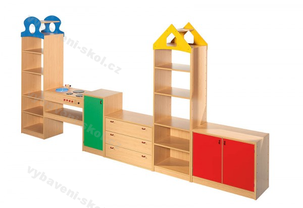Oblíbená dřevěná nábytková sestava do dětských pokojíčků, center, herny, mateřských a základních škol. Praktické a pevné skříně, poličky, zásuvky s úložným a hracím prostorem. Atraktivní barevné stříšky vysokých policových skříní. Bezpečný, nezávadný, přírodní materiál dřevo. Oboustranně laminované korpusy (18 mm) v přírodním dezénu chrání na nejvíce namáhaných částech 2 mm ABS hrany.