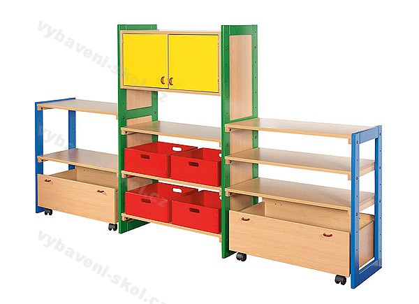 Nábytková sestava složená z jednotlivých komponentů nábytkového programu MIKI PLUS. Korpusy a dvířka skříněk jsou vyrobeny z laminované dřevotřísky v několika dezénech o síle 18 mm, hrany jsou ošetřeny proti poškození 2 mm ABS hranou. Zásuvky jsou vyrobeny ze spárové bukové desky v několika barevných provedeních a jsou ošetřeny polyuretanovým lakem.