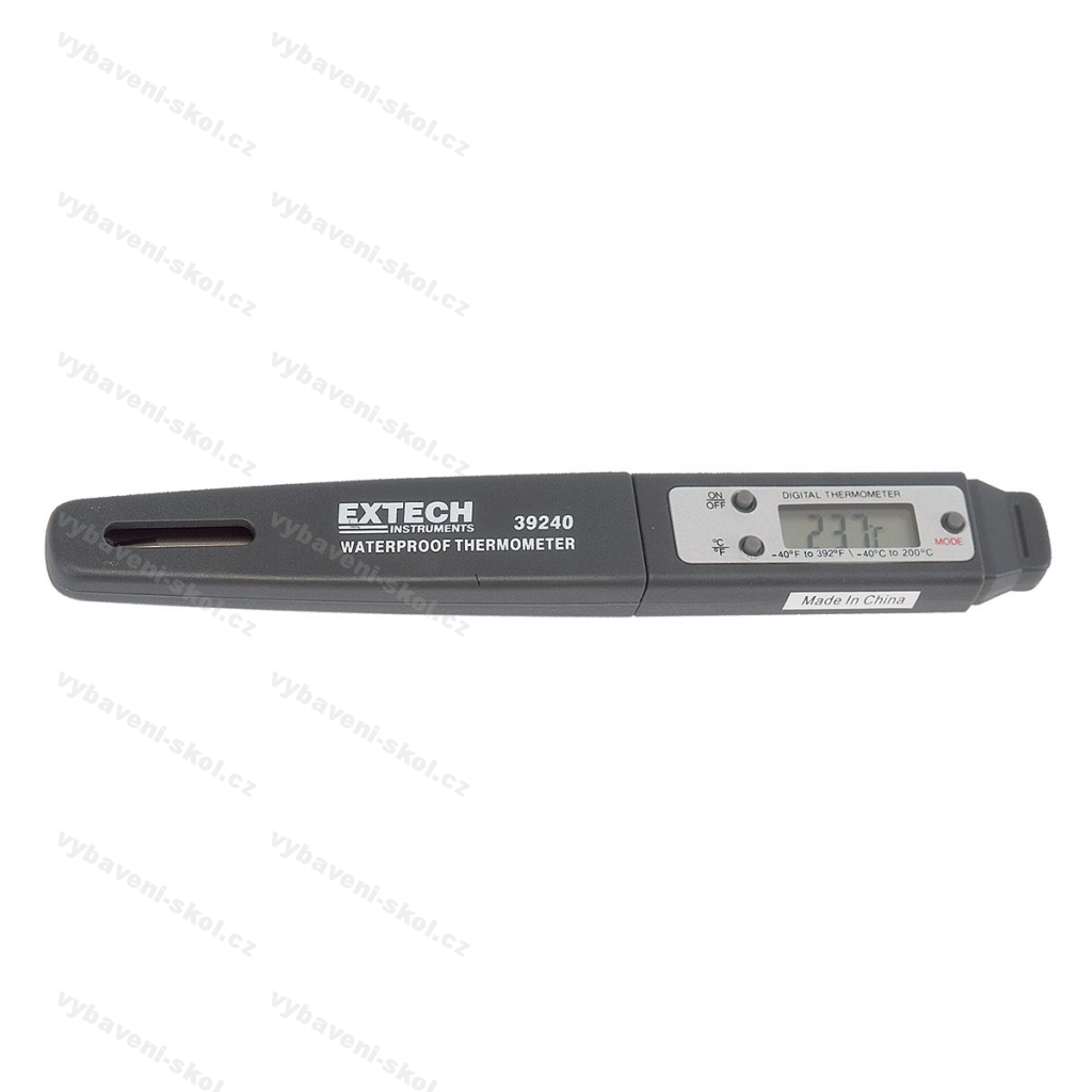 Nerezový měřicí hrot s ochranným pouzdrem. Vodotěsný, přepínání °C/°F, funkce min./max./hold. Automatické vypínání. Rozsah -40 °C až +200 °C, přesnost 1 °C. Velikost 15 x 2 x 1,8 cm, hmotnost 56 g.