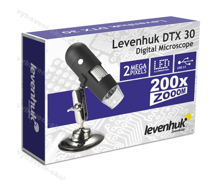 Levenhuk DTX 30 je moderní digitální mikroskop s rozhraním USB disponující zvětšením v rozsahu 20-230x a vybavený digitálním fotoaparátem s rozlišením 2 Mpx, který umožňuje pořizovat fotografie a videozáznamy pozorovaných preparátů. Tento model nalezne využití v radioelektronice, klenotnictví, biologii, zoologii a řadě dalších odvětví.