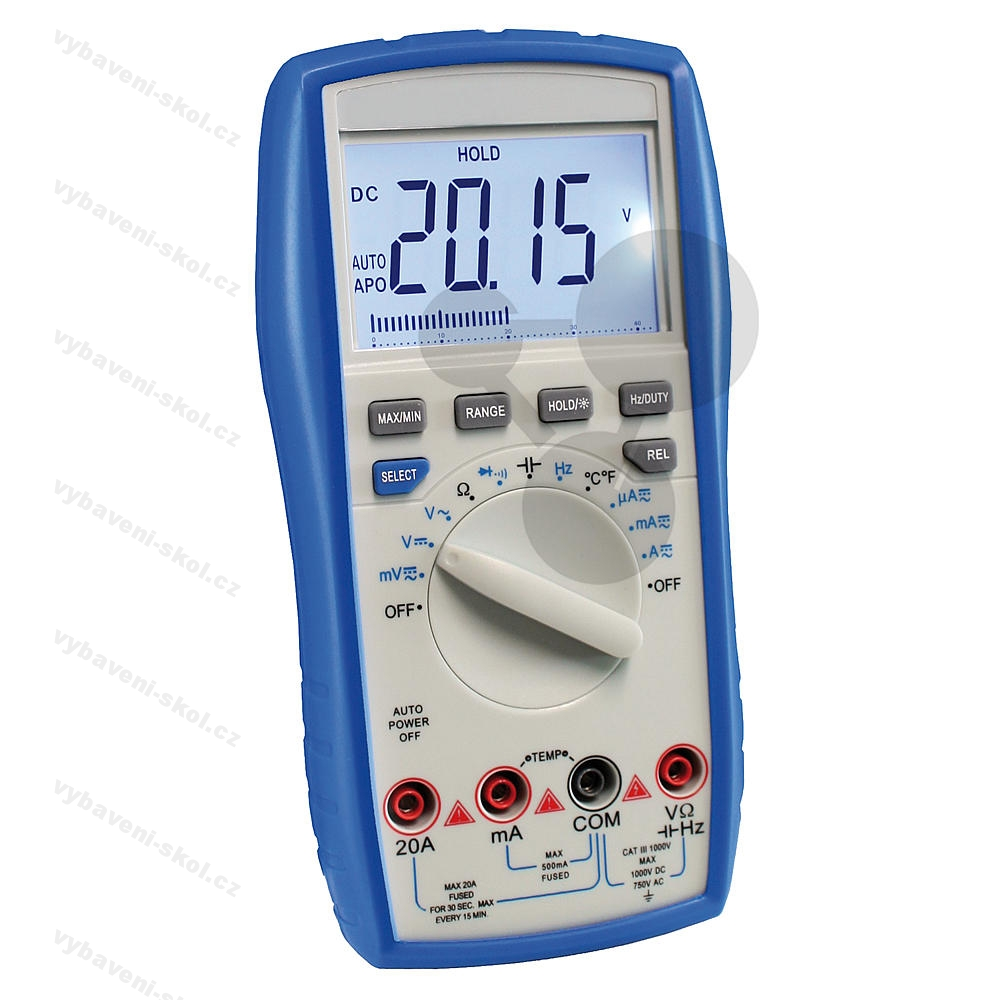 Nově vyvinutý digitální multimetr, který se vyznačuje snadnou obsluhou, moderním a praktickým designem a rozsáhlými měřicími funkcemi. Díky vysokému bezpečnostnímu standardu kategorie přepětí CAT III 1000 V a použití velkého digitálního displeje s podsvícením se tento kvalitní přístroj obzvláště hodí pro vzdělávací účely.
