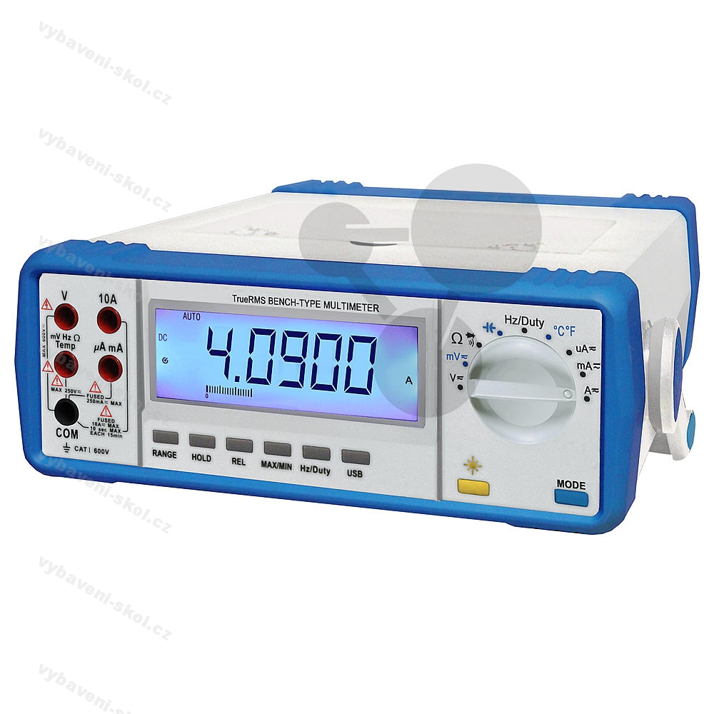 Digitální stolní multimetr má vysoce přesné měřicí funkce a velký, podsvícený 4 1/2místný LCD displej. Může se používat v laboratoři, napájený ze sítě, nebo také mobilně na bateriový provoz. Přístroj přitom nabízí celou řadu možností použití.