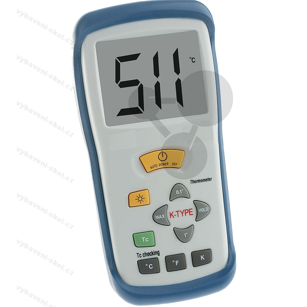 Zobrazení ve °C, °F, nebo K. Levný přístroj s podsvícením.