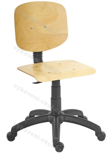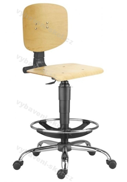Dílenská židle s bukovou překližkou na sedáku a opěráku, nastavitelný úhel opěráku, nastavitelná výška opěráku a hloubka sedáku, plynový píst, nosnost s plastovou bází 120 kg nebo s chromovou bází 130 kg, záruka 24 měsíců. Područky nelze montovat.