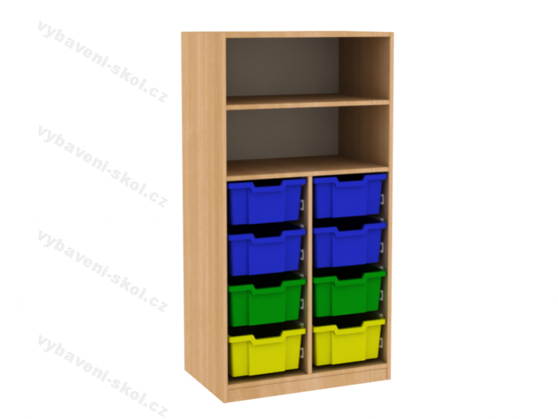 Kvalitní a účelový nábytek vhodný do všech dětských interiérů. Horní část tvoří otevřené police, spodní část je vybavená plastovými boxy. Na výrobu středně vysoké dětské skříňky je použitá oboustranně laminovaná dřevotřísková deska o síle 18 mm, odstín k výběru z naší nabídky. Stavitelné široké police mají každá nosnost 30 kg. 2 mm ABS hrana chrání nejvíce zatěžované hrany skříňky. Plastové boxy pod kódem 77001004 jsou vyrobené z lehkého, odolného a nezávadného plastu, snadné vysouvání zajišťují stabilní kolejničky. Výběr barvy (průhledná, žlutá, červená, modrá a zelená) uvádějte do poznámek. Skříň je ustavená na soklu vysokém 5 cm. Rozměry 136x70x45 cm (V x Š x H).