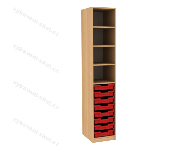 Nová série dřevěných dětských skříní je navržená v jednoduchém, moderním designu s důrazem na funkčnost. Vysoká dětská skříň je otevřená, horní část vyplňují stavitelné police, každá o nosnosti 30 kg, spodní díl vyplňují plastové zásuvky uložené na pevných kolejničkách. Stabilní konstrukce skříně je vyrobená z oboustranně laminované dřevotřískové desky silné 18 mm, v dezénu dle našeho výběru. Všechny namáhané hrany skříně chrání odolná 2 mm ABS hrana. Plastové boxy pod kódem 77001003 jsou vyrobené z lehkého, odolného a nezávadného plastu. Výběr barvy (průhledná, žlutá, červená, modrá a zelená) uvádějte do poznámky. Skříň je ustavená na soklu vysokém 5 cm. Rozměry 187x36x45 cm (V x Š x H).