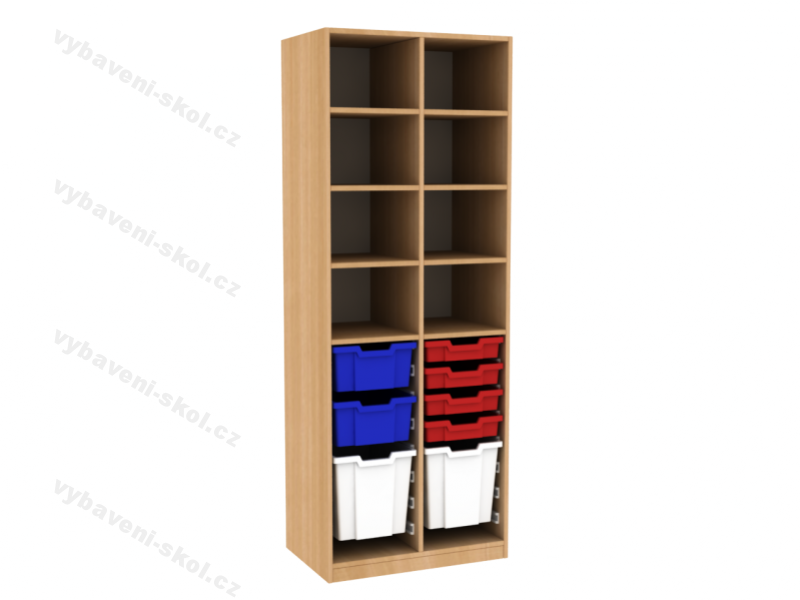 Funkční a praktické dětské dřevěné skříně v jednoduchém, moderním designu plně vyhovují potřebám dětských interiérů. Vysokou širokou skříň v horní části vyplňují stavitelné police, každá o nosnosti 30 kg, dolní úložný prostor tvoří plastové zásuvky na pevných kolejničkách. Konstrukce skříně je zhotovená z oboustranně laminované dřevotřískové desky silné 18 mm, v dekoru dle výběru. Nejvíce namáhané hrany skříně chrání odolná 2 mm ABS hrana. Plastové boxy (pod kódem 77001003 malé, 77001004 střední, 77001005 velké) jsou vyrobené z lehkého, nezávadného a trvanlivého plastu. Zásuvky v barvách průhledná, žlutá, červená, modrá a zelená (výběr uvádějte do poznámek). Spodní část skříně tvoří 5 cm vysoký sokl. Rozměry 187,4x70x45 cm (V x Š x H).