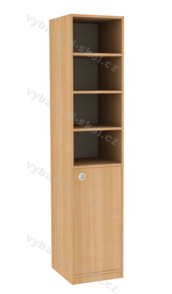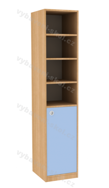 Vybavení pro dětské interiéry rozšiřujeme o dřevěný, kvalitní a praktický nábytek v moderních, jednoduchých liniích. Vysoká skříň je kombinací otevřených polic a poliček krytých dvířky. Nosnost stavitelné police je 30 kg. Na výrobu skříně s prakticky členěným úložným prostorem, je použitá dřevotřísková deska silná 18 mm, odstín k výběru z naší nabídky, oboustranně laminovaná. Všechny často používané hrany skříně chrání odolná 2 mm ABS hrana. Spodní část skříně tvoří 5 cm vysoký sokl. Dveře nabízíme v různých barvách, jsou opatřené kovovými úchyty (více druhů). Možnost uzamykání skříňky. Rozměry 187x40x45 cm (V x Š x H).