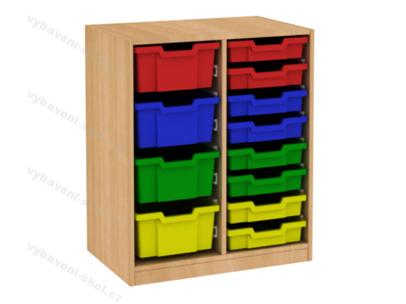 Nová řada dětských dřevěných skříní. Do praktické, nízké skříňky s barevnými, plastovými zásuvkami si dětské hračky, oblečení nebo společenské hry, mohou ukládat přímo malé děti. Korpus je vyrobený z oboustranně laminované dřevotřískové desky o síle 18 mm, v dezénu dle naší nabídky. Všechny namáhané hrany skříňky jsou opatřené odolnou 2 mm ABS hranou. Vnitřní úložný prostor je vybavený kolejničkami s plastovými boxy (pod kódem 77001003 malé, 77001004 střední). Plast je lehký, trvanlivý a nezávadný. Zvolené barvy (průhledná, žlutá, červená, modrá a zelená) rozepište do poznámek. Skříňka je ustavená na 5 cm vysokém soklu. Rozměry 84x70x45 cm (V x Š x H).