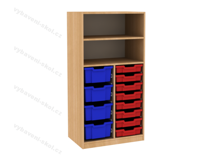 Praktický dětský nábytek představuje široká, středně vysoká skříňka navržená v jednoduchých, moderních liniích. Horní díl skříně tvoří otevřené police, spodní část je vybavená plastovými zásuvkami. Pro výrobu dětské skříňky je použitá oboustranně laminovaná dřevotřísková deska o síle 18 mm, odstín k výběru z naší nabídky. Stavitelné police mají každá nosnost 30 kg. 2 mm ABS hrana chrání nejvíce zatěžované hrany skříňky. Plastové boxy malé pod kódem 77001003, střední 77001004, jsou vyrobené z lehkého, nezávadného a trvanlivého plastu, snadné vysouvání zajišťují stabilní kolejničky. Výběr barvy (průhledná, žlutá, červená, modrá a zelená) uvádějte do poznámky. Skříň je ustavená na soklu vysokém 5 cm. Rozměry 136x70x45 cm (V x Š x H).