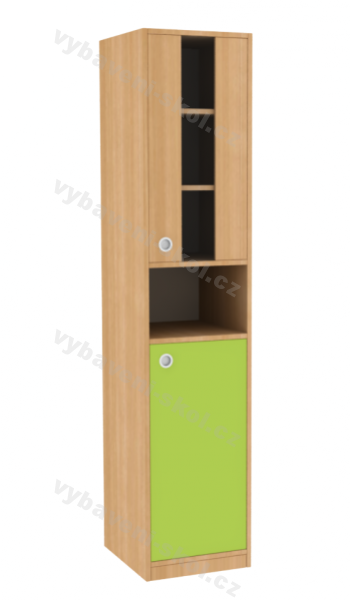 Kvalitní, nová série dětských dřevěných skříní je navržená v moderním, jednoduchém stylu. Vysoká skříň disponuje úložným prostorem krytým dveřmi, horní část je navíc prosklená, střed tvoří otevřená police. Vnitřní část skříně vyplňují stavitelné police, každá o nosnosti 30 kg, pro ukládání dětských hraček, cvičebních a didaktických pomůcek, relaxačních podložek a polštářů, oblečení atd. Skříň je zhotovená z oboustranně laminované dřevotřískové desky silné 18 mm, v dezénu dle naší nabídky. Dveře lze vybírat v několika barvách, jsou opatřené kovovými úchyty (v nabídce více druhů). K doplnění zámky. Nejvíce namáhané hrany skříně chrání odolná 2 mm ABS hrana. Spodní část skříně tvoří 5 cm vysoký sokl. Rozměry 187x40x45 cm (V x Š x H).
