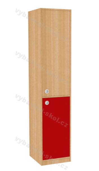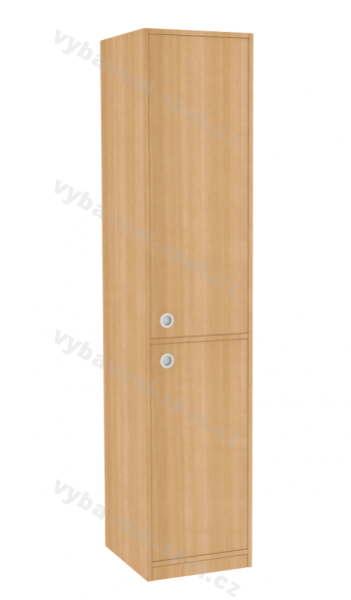 Nová řada dětských skříní představuje dřevěné, kvalitní a účelové vybavení do všech interiérů pro děti různého věku. Skříně jsou navržené v moderním, čistém stylu. Vysoká skříň s vnitřním policovým systémem, je rozdělená na horní a spodní část. Čelní stranu skříně tvoří dveře s kovovými úchyty (v nabídce více druhů). Pevné dveře lze objednat v různých barevných odstínech, doplnit o zámky pro horní i dolní část skříně. Stavitelné police mají každá nosnost do 30 kg. Skříň je zhotovená z oboustranně laminované dřevotřískové desky silné 18 mm, v dezénu k výběru z naší nabídky. Nejvíce používané hrany skříně chrání odolná 2 mm ABS hrana. Skříň je ustavená na 5 cm vysokém soklu. Rozměry 187x40x45 cm (V x Š x H).