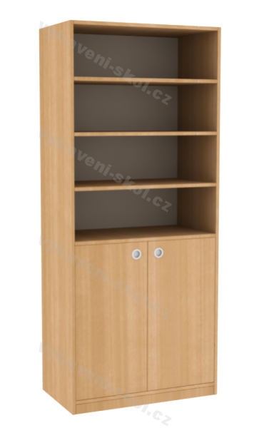 Vybavení pro dětské interiéry rozšiřujeme o dřevěný, kvalitní a účelový nábytek v moderních, jednoduchých liniích. Vysoká skříň je kombinací otevřených širokých polic a poliček krytých dvířky. Na výrobu skříně s prakticky členěným úložným prostorem, je použitá laminovaná deska silná 18 mm, dezén dle výběru. Všechny namáhané hrany skříňky chrání odolná 2 mm ABS hrana. Nosnost každé stavitelné police je max. 30 kg. Spodní část skříně tvoří 5 cm vysoký sokl. Dveře nabízíme v různých barvách, jsou opatřené kovovými kruhovými úchyty (více druhů). Možnost uzamykání spodní skříňky. Rozměry 187,4x80x45 cm (V x Š x H).