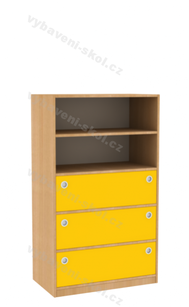 Představujeme novou řadu dřevěného, kvalitního a účelového nábytku, který dokonale vyhovuje potřebám dětských domácích i společenských interiérů. Středně vysoká skříňka se skládá z otevřených a uzavřených poliček. Na výrobu skříně s prakticky členěným úložným prostorem, je použitá oboustranně laminovaná dřevotřísková deska o síle 18 mm, odstín k výběru z naší nabídky. Stavitelné police a široké zásuvky mají každá nosnost max. 30 kg. Všechny namáhané hrany skříňky chrání odolná 2 mm ABS hrana. Spodní část skříně tvoří 5 cm vysoký sokl. Zásuvky je možné vybírat v různých barvách, jsou vybavené kovovými snadno uchopitelnými úchyty (více druhů). Zásuvkový systém je možné opatřit zámkem. Rozměry 136x80x45 cm (V x Š x H).