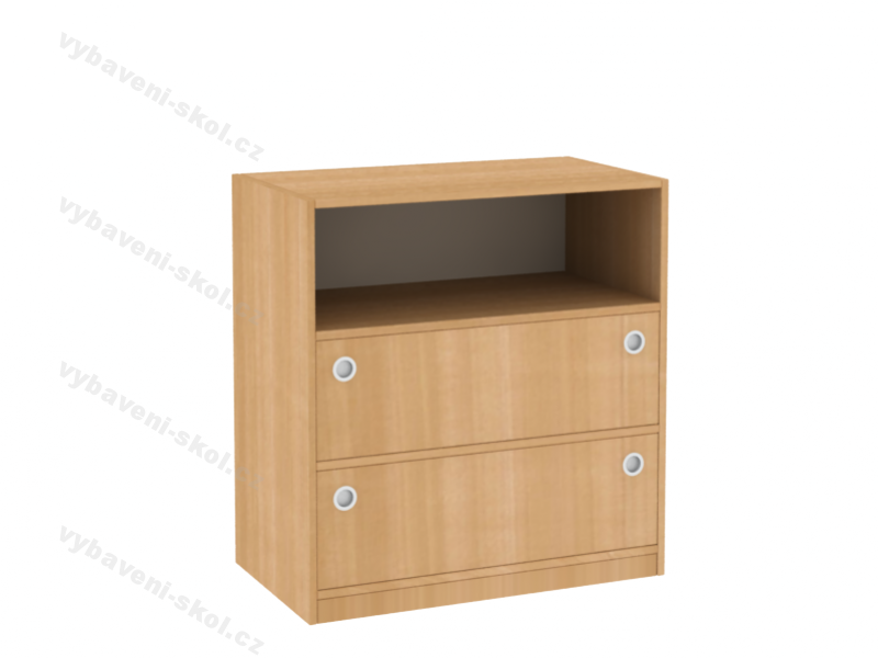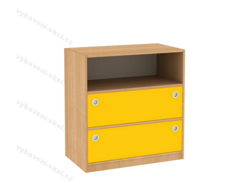 Nová série dřevěného, kvalitního a účelového nábytku velmi dobře vyhovuje potřebám dětských pokojíčků, center, heren, mateřských nebo základních škol. Ukládání různých věcí samostatně zvládnou i nejmenší děti. Nízká skříňka se skládá z otevřené poličky a dvou zásuvek (je možné přidat zámek). Dětská skříňka je zhotovená z oboustranně laminované dřevotřískové desky o síle 18 mm, odstín k výběru z naší nabídky. Police a široké zásuvky mají každá nosnost 30 kg. Nejvíce namáhané hrany skříně jsou opatřené odolnou 2 mm ABS hranou Skříňka je ustavená na 5 cm vysokém soklu. Zásuvky je možné vybírat v různých barvách, jsou vybavené kovovými snadno uchopitelnými úchyty (více druhů). Rozměry 84x80x45 cm (V x Š x H).
