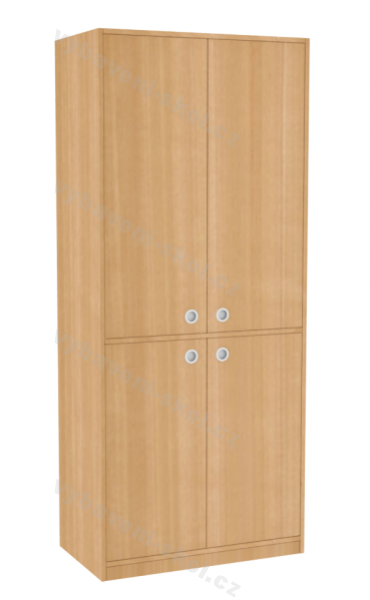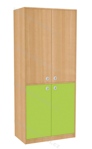 Atraktivní nová řada dětských skříní představuje dřevěné, kvalitní a účelové vybavení do všech interiérů pro děti různého věku. Skříně jsou navržené v moderním, čistém stylu. Vysoká skříň s vnitřním policovým systémem, je rozdělená na horní a spodní část, každou kryjí dvoukřídlé dveře s kruhovými kovovými úchyty (v nabídce další druhy). Pevné dveře lze objednat v různých barevných odstínech, doplnit o zámky pro horní i dolní část skříně. Stavitelné široké police mají každá nosnost 30 kg. Skříň je zhotovená z oboustranně laminované dřevotřískové desky silné 18 mm, s výběrem dezénu. Nejvíce používané hrany skříně chrání odolný ABS systém (tloušťka 2 mm). Skříň je ustavená na 5 cm vysokém soklu. Rozměry 187,4x80x45 cm (V x Š x H).