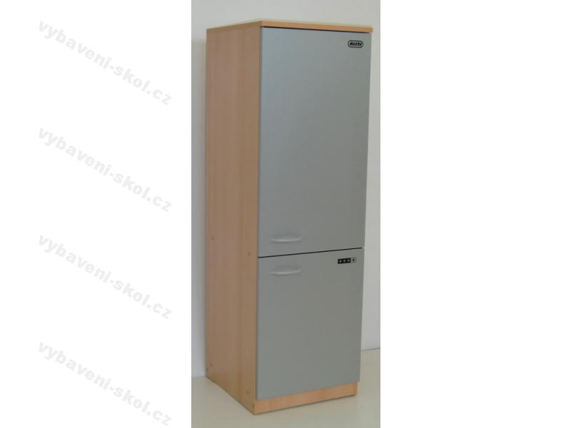 Praktickou součástí všech dětských moderních kuchyněk je kombinovaná lednička s mrazničkou. Dřevěnou skříňku vyplňuje pět poliček a drátový úložný systém, vše kryté dvířky. Korpus skříňky je standardně vyráběn ve dvou dezénech lamino desek o síle 18 mm. Dvířka jsou v několika barevných provedeních lamino desek o síle 18 mm. Všechny namáhané plochy jsou opatřeny 0,5 až 2 mm ABS hranou, která je chrání před poničením a dá se vybrat z několika barevných variant.