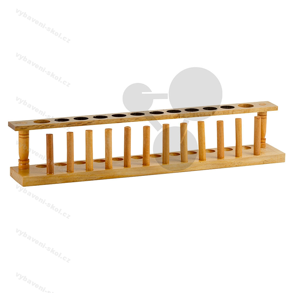 Dřevěný stojan pro 12 zkumavek. 385 x 47 x 115 mm. Průměr 20 mm.