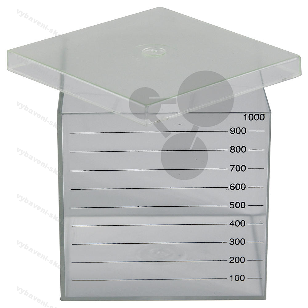 Krychle 10 x 10 x 10 cm (vnitřní rozměry) z průhledného plastu, opatřená stupnicí s 10 dílky, lze naplnit vodou.