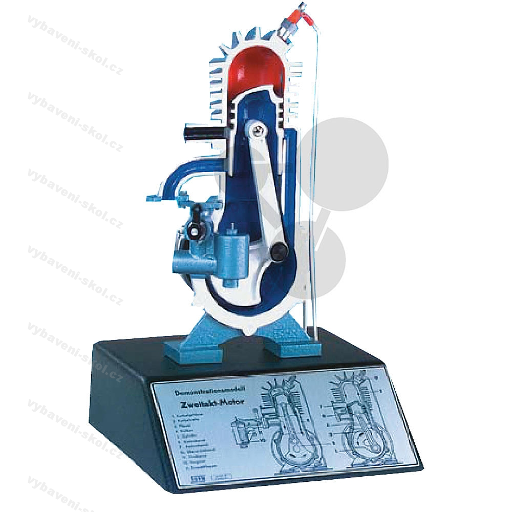 Model vzduchem chlazeného dvoutaktního benzínového motoru v průřezu. Setrvačníkový pohon. Zapalovací jiskra je indikována rozsvícením žárovky v zapalovací svíčce. Přípojka baterie.