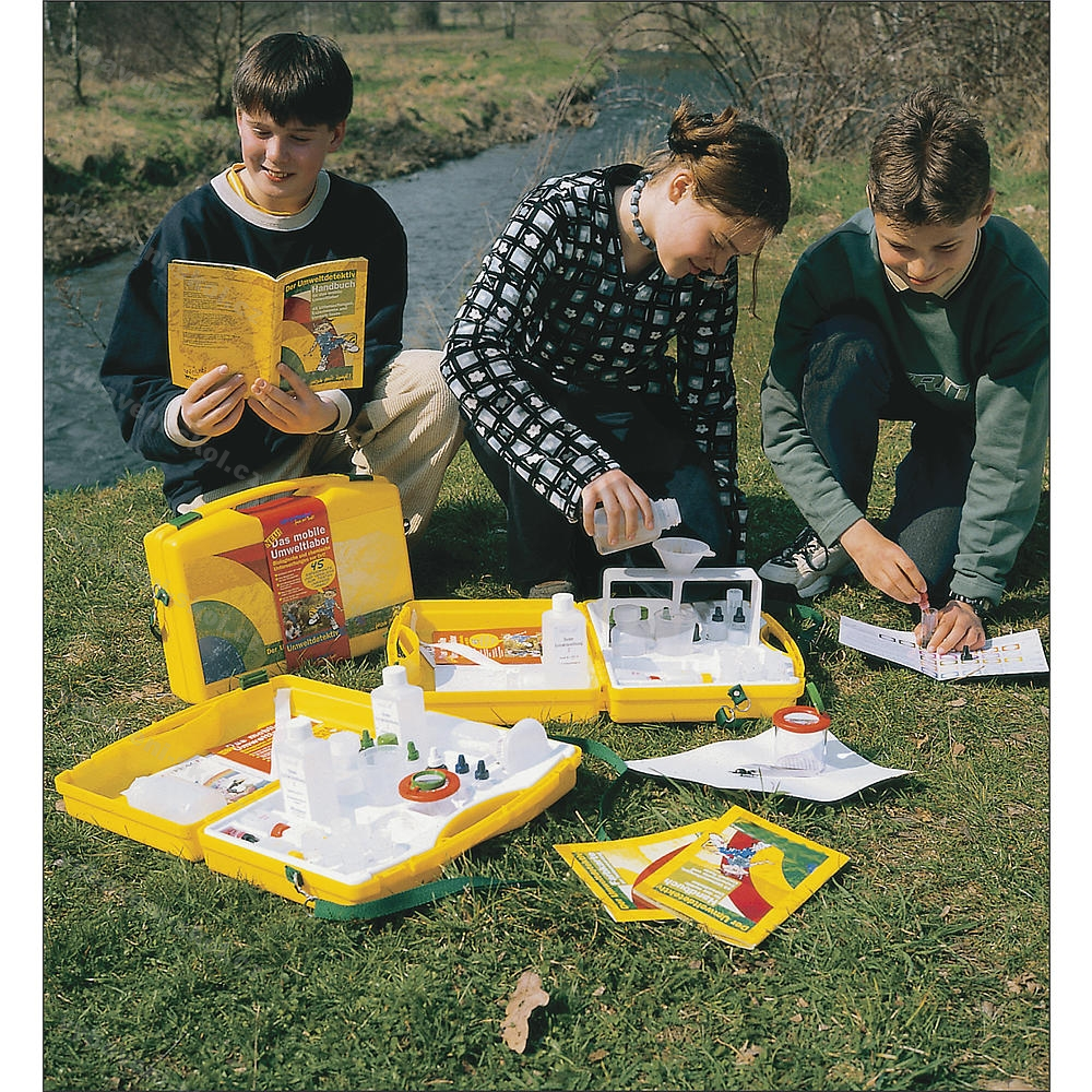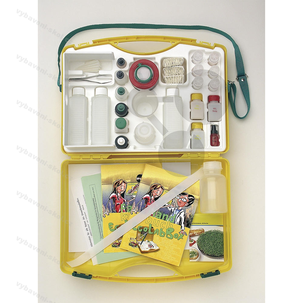 ECOLABBOX obsahuje důležité pomůcky pro práci ve volné přírodě nebo ve třídě: barevnou kartu pro zjišťování naměřených hodnot jednotlivých parametrů, filtrační stojan umožňuje bezpečnější filtrování v kufříku, zasunovací lupu v plastovém pouzdru pro lepší rozpoznání drobných živočichů, speciální pinzetu pro šetrné pozorování drobných živočichů, vodě odolnou podložku DIN A4 pro biologická zkoumání, filtrační papír na výrobu roztoků z půdních extraktů, nálevku, po 1 láhvi pracovní a na vzorky 100 ml a 250 ml, odměrku a plastové pipety. Kromě toho: robustní plastový kufřík a vložka na náčiní jsou vyrobeny ze 100% recyklovaného polypropylenu (PP). Pevný popruh je nastavitelný.